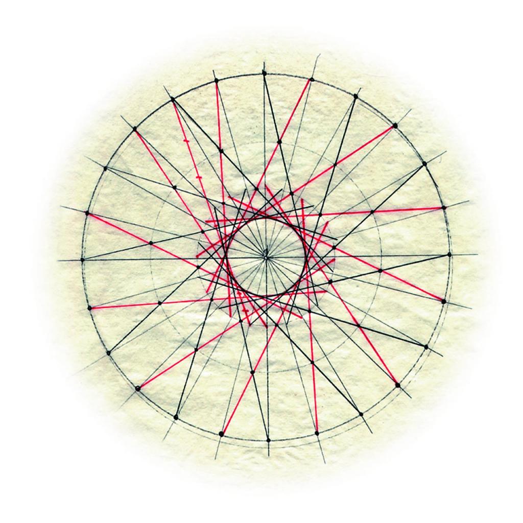 Miután rögzítettük a kétirányú spirál hálózatot kirajzoló vázszerkezetet, vékony vesszőkkel fontuk be. Két bejáratot készítettünk, az egyiket a bányaudvar legnagyobb sziklája - az Oltárkő - irányába, a másikat a tábortűz helyének irányába, ami az előzővel 90°-ot zárt be, ez az augusztus 20-i napfelkelte iránya is.