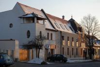 A domboldalba benyomva az épület kiszolgáló racionális részei (konyha, raktárak, öltözők, kazán) egyenes vonalvezetéssel-?szálkák, szárak?. A tetejére ?ráfolyik? a hegy, a zöld (zöldtető). Ebből a ?sötétségből? születnek meg az épület íves karjai, melyek körül ölelik a díszudvart, a főbejáratot...
